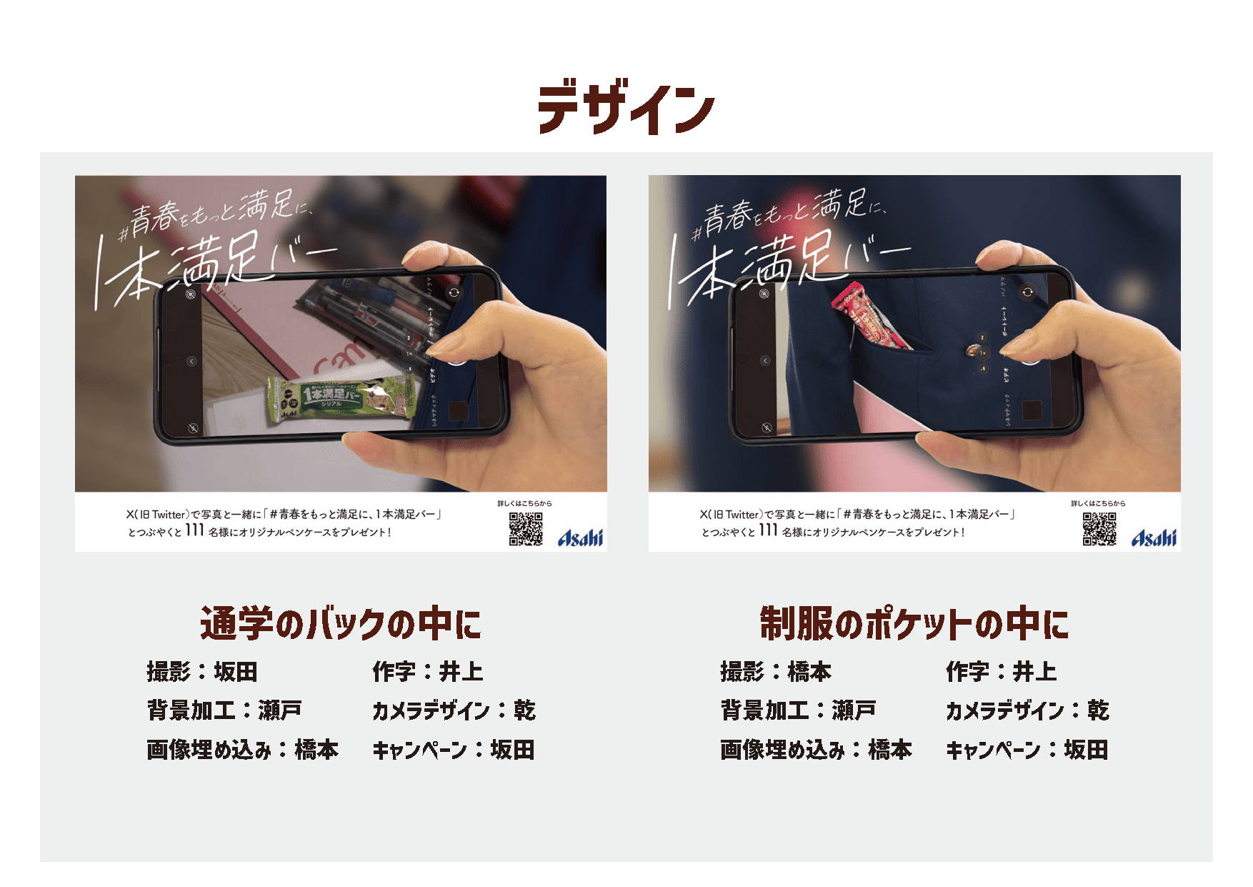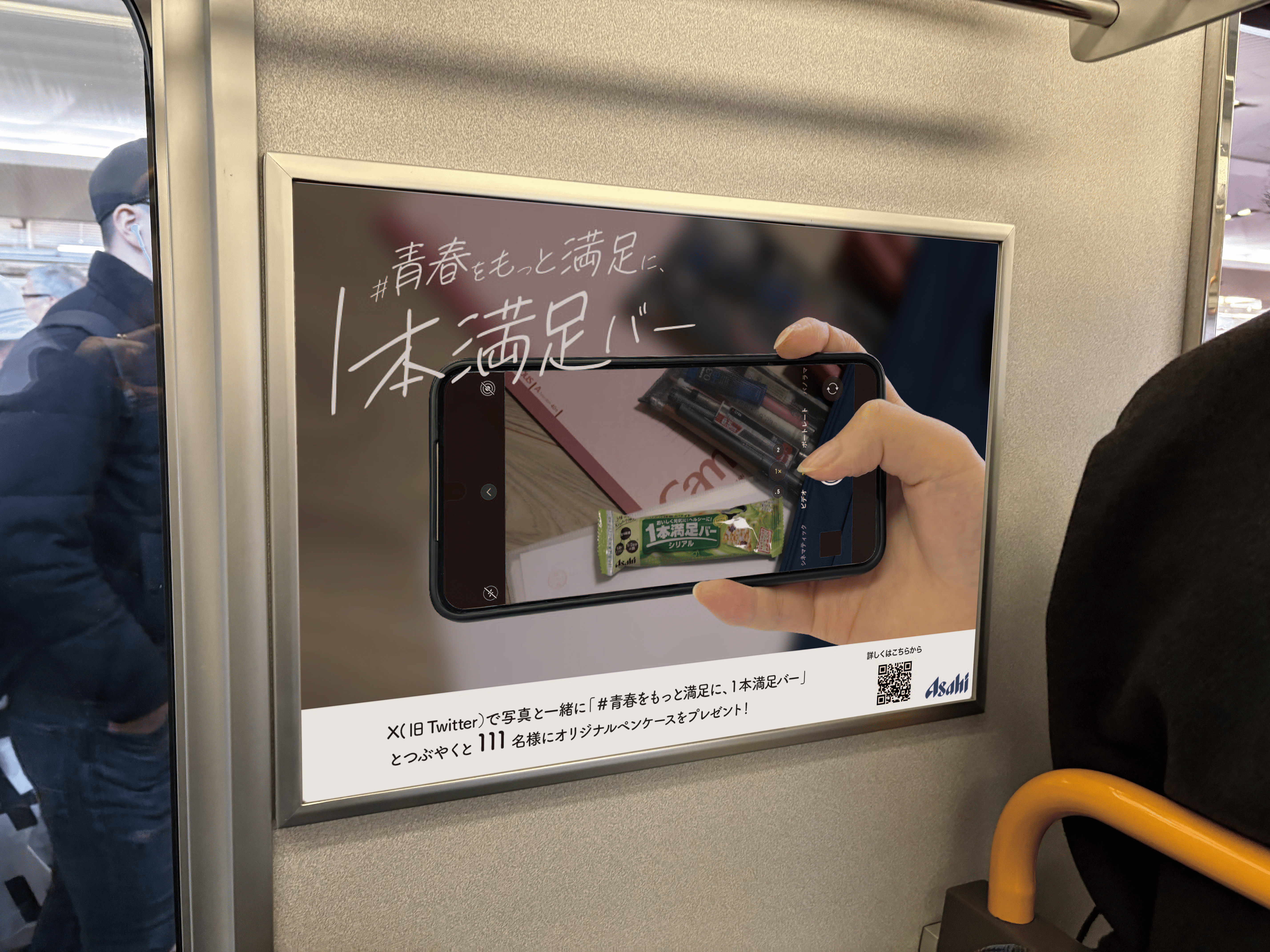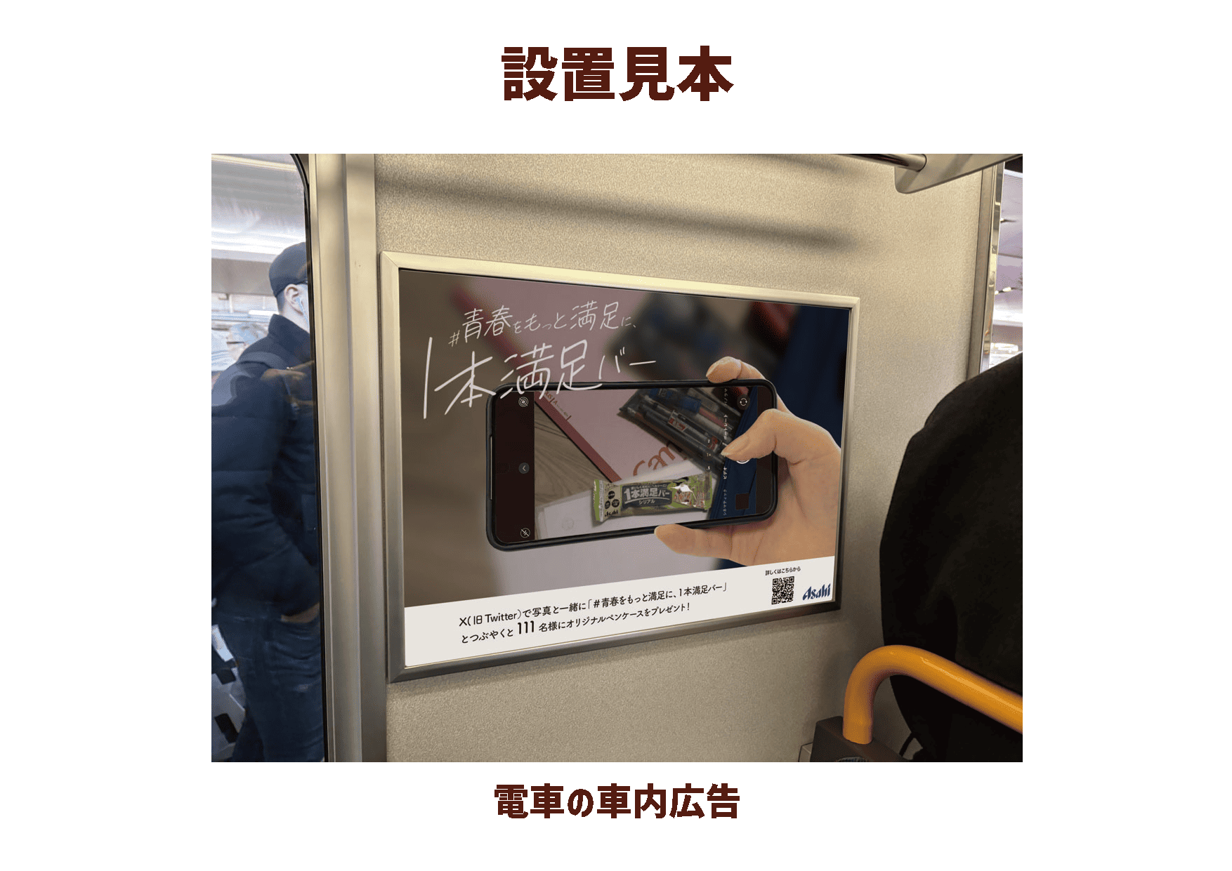 「1本満足バー」を調査したところ、社会人などがメインターゲットでした。もっと購入者の幅を広げたいと思い、中高生に共感される電車内のドア横ポスターをデザインしました。